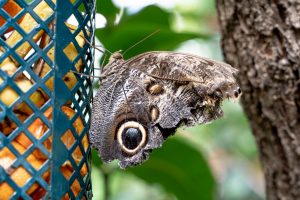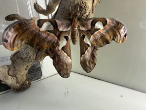 When you visit, you’ll find that some of our moths are in a separate area near the chrysalis chamber. Spectacular species like the Atlas moth don’t eat as adults; they don’t even have functional mouths! Instead, they survive on the energy stored as caterpillars and spend their short adult lives focused on reproduction. To prevent them from laying eggs in Wings of the Tropics, we keep these moths in a separate space.